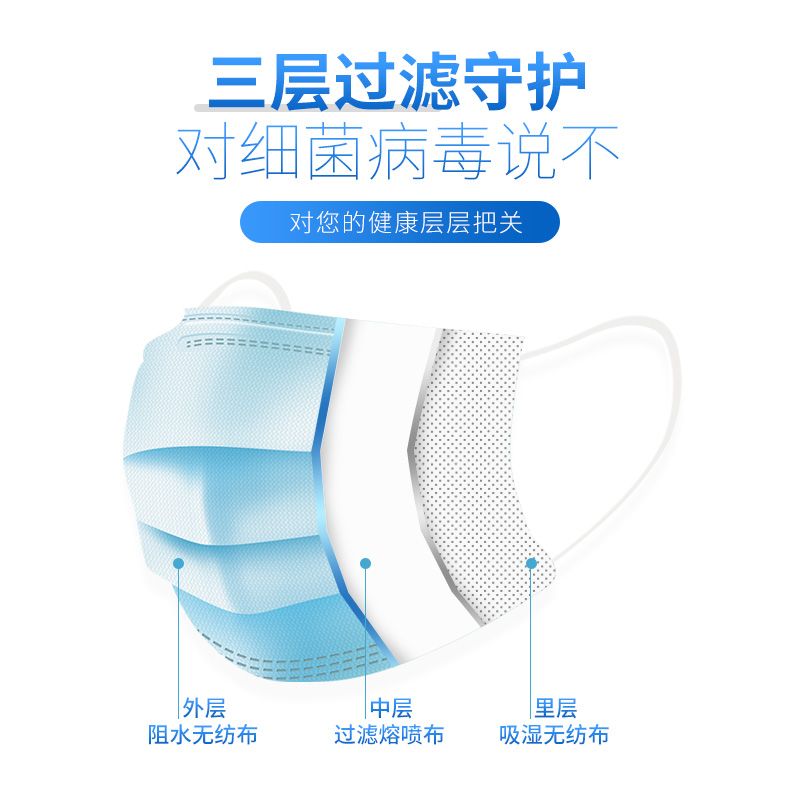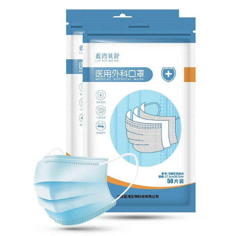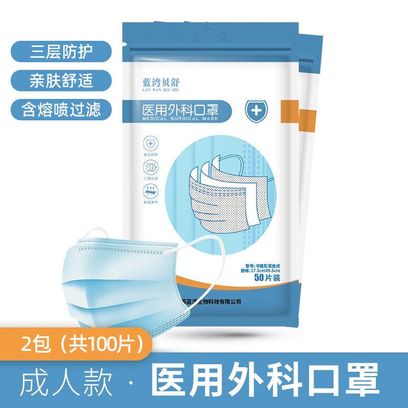 商品名称:蓝湾贝舒口罩一次性医用外科口罩三层无纺熔喷布防护隔离飞沫口沫