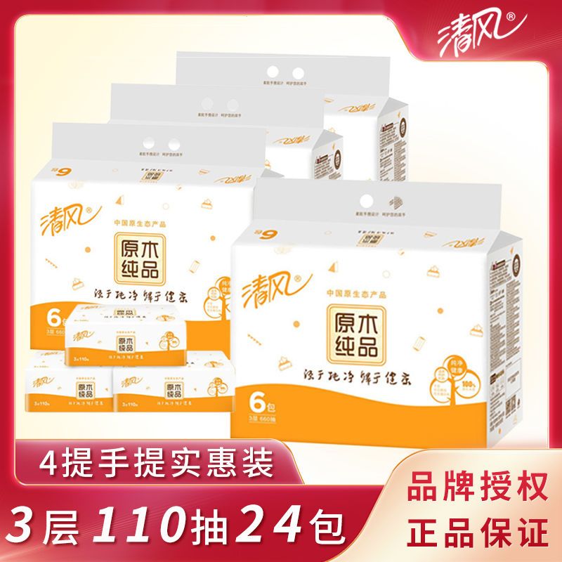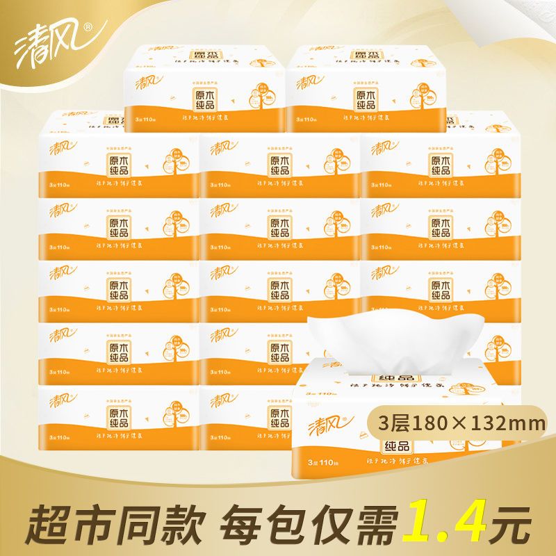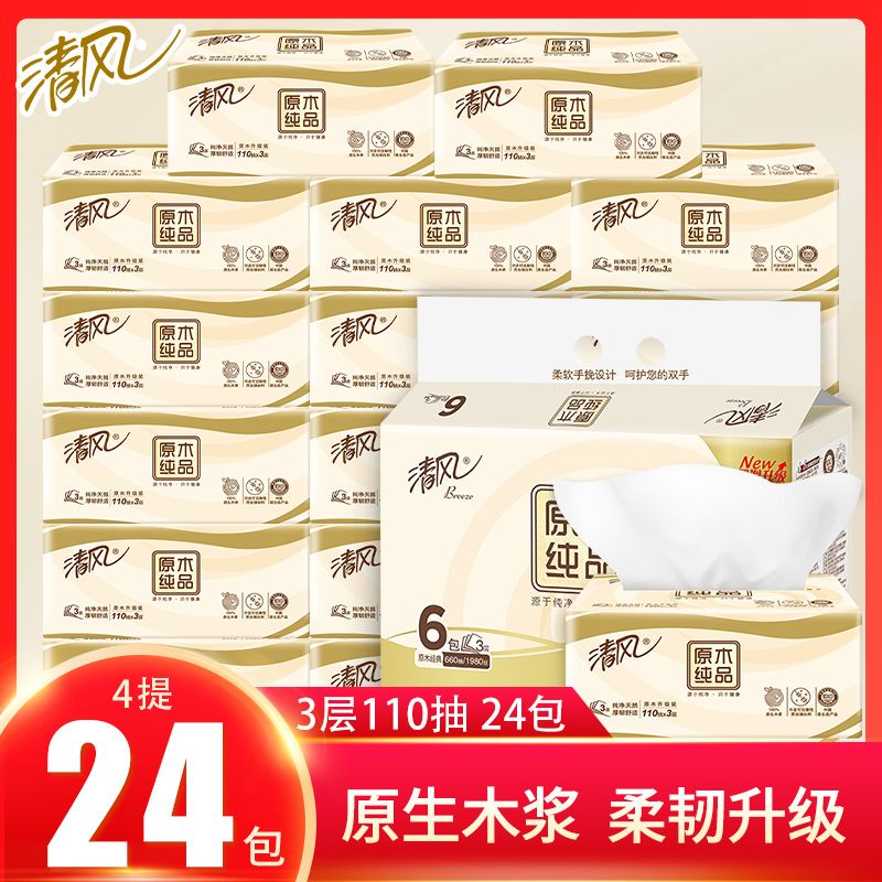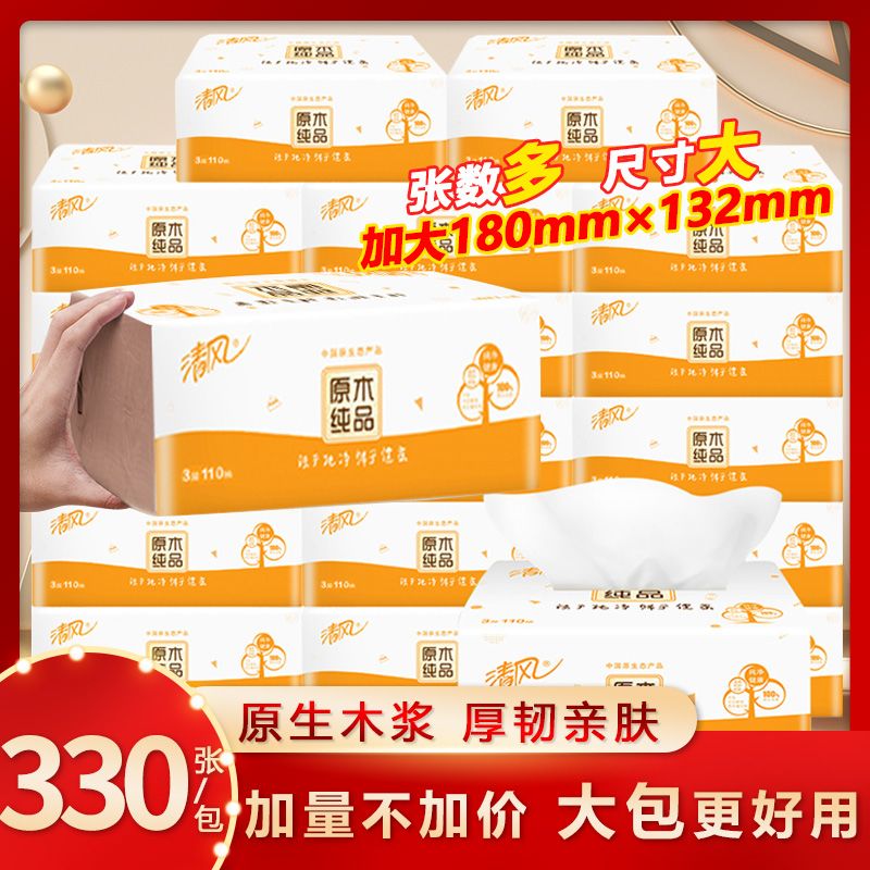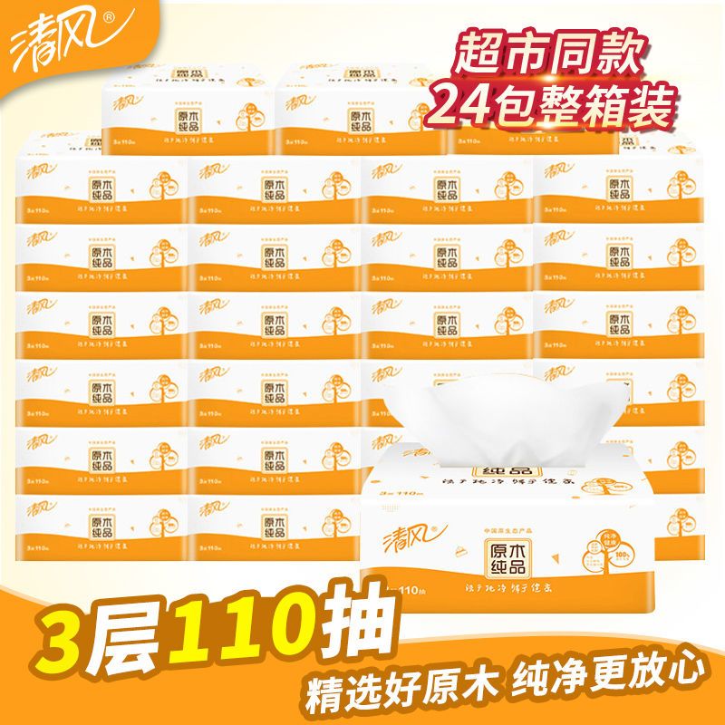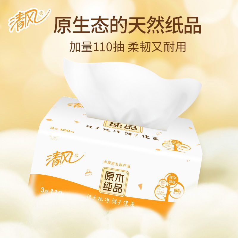 商品名称:清风纸巾抽纸批发家用餐巾纸家庭实惠装面巾纸卫生纸原木3层110抽