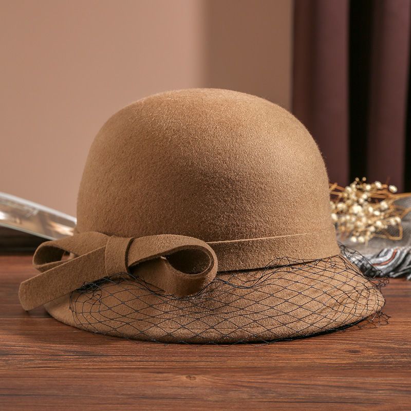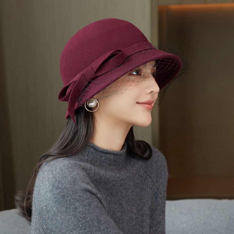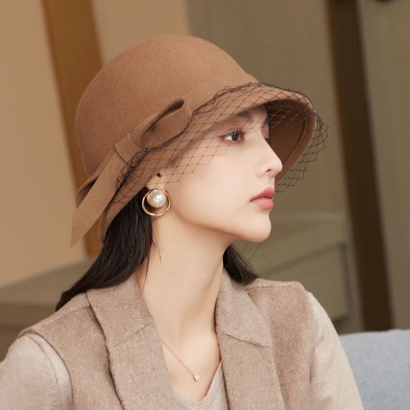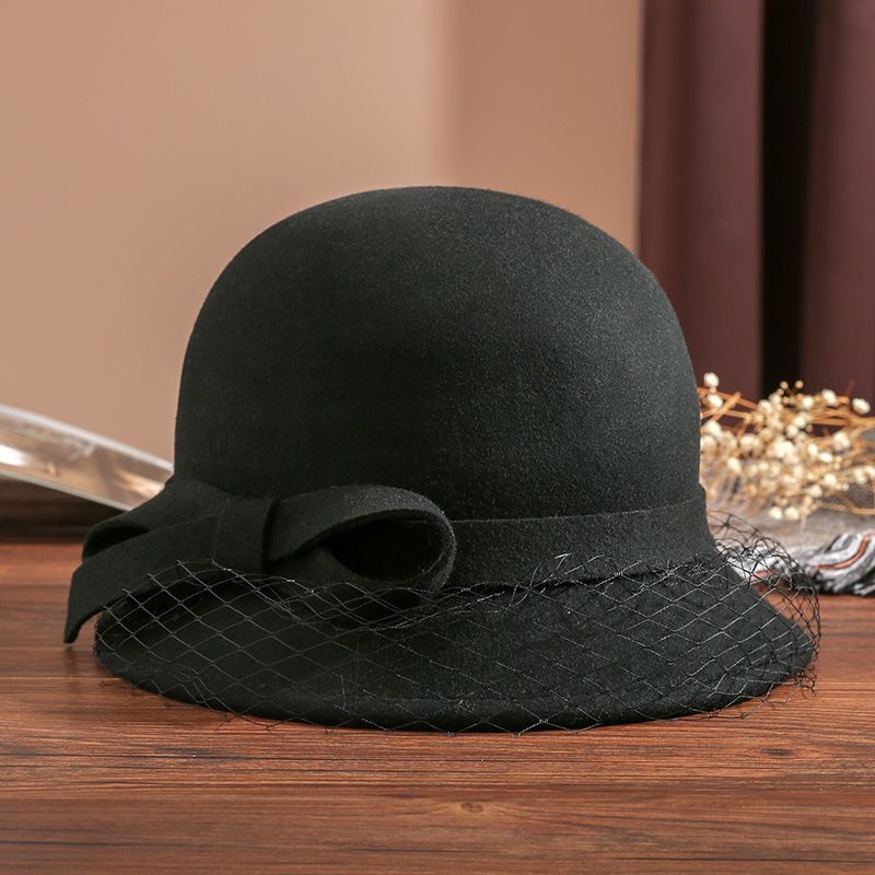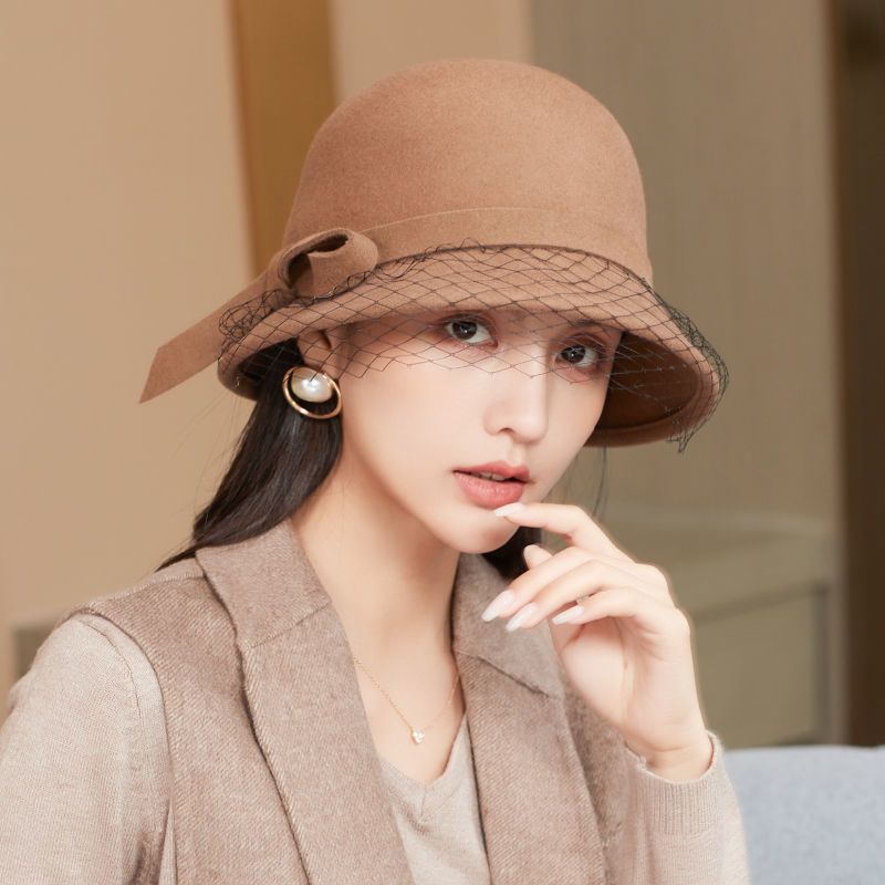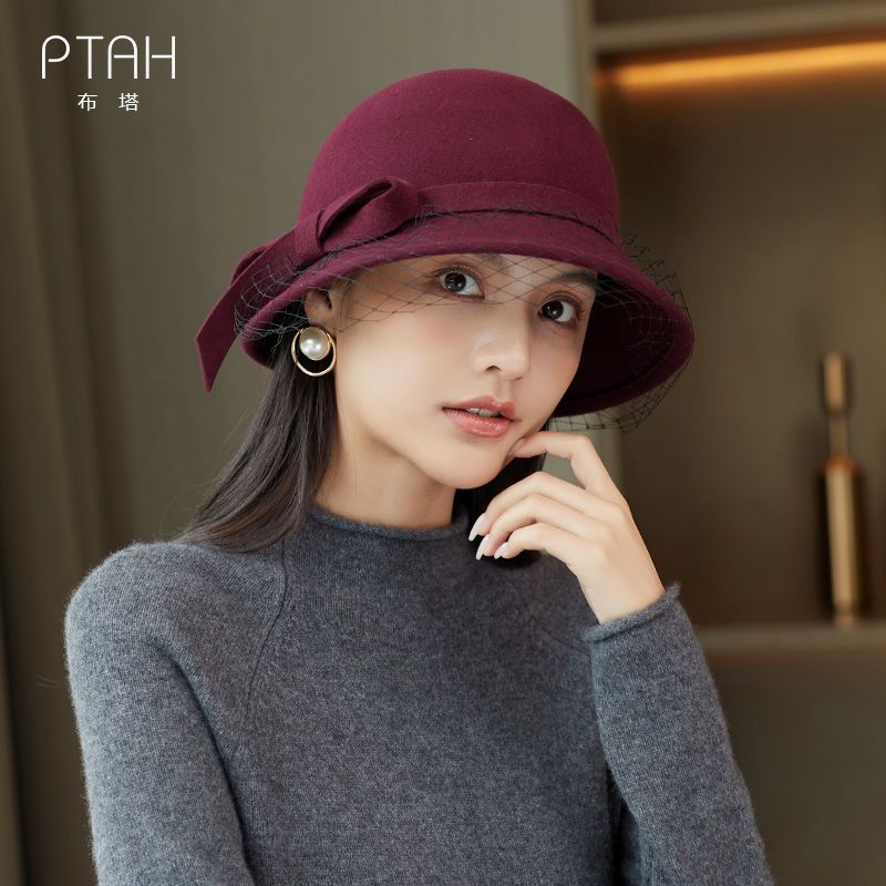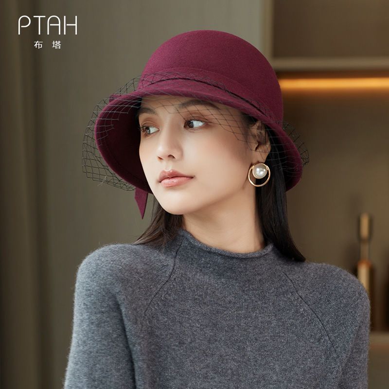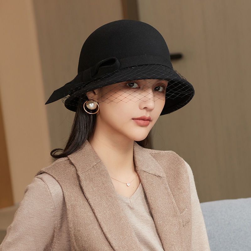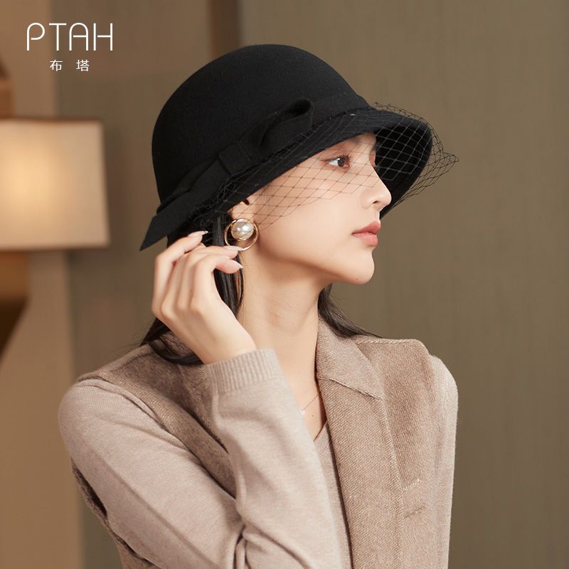 商品名称:布塔秋冬新款英伦复古羊毛礼帽优雅百搭纱网大檐冬季黑色女士帽子
