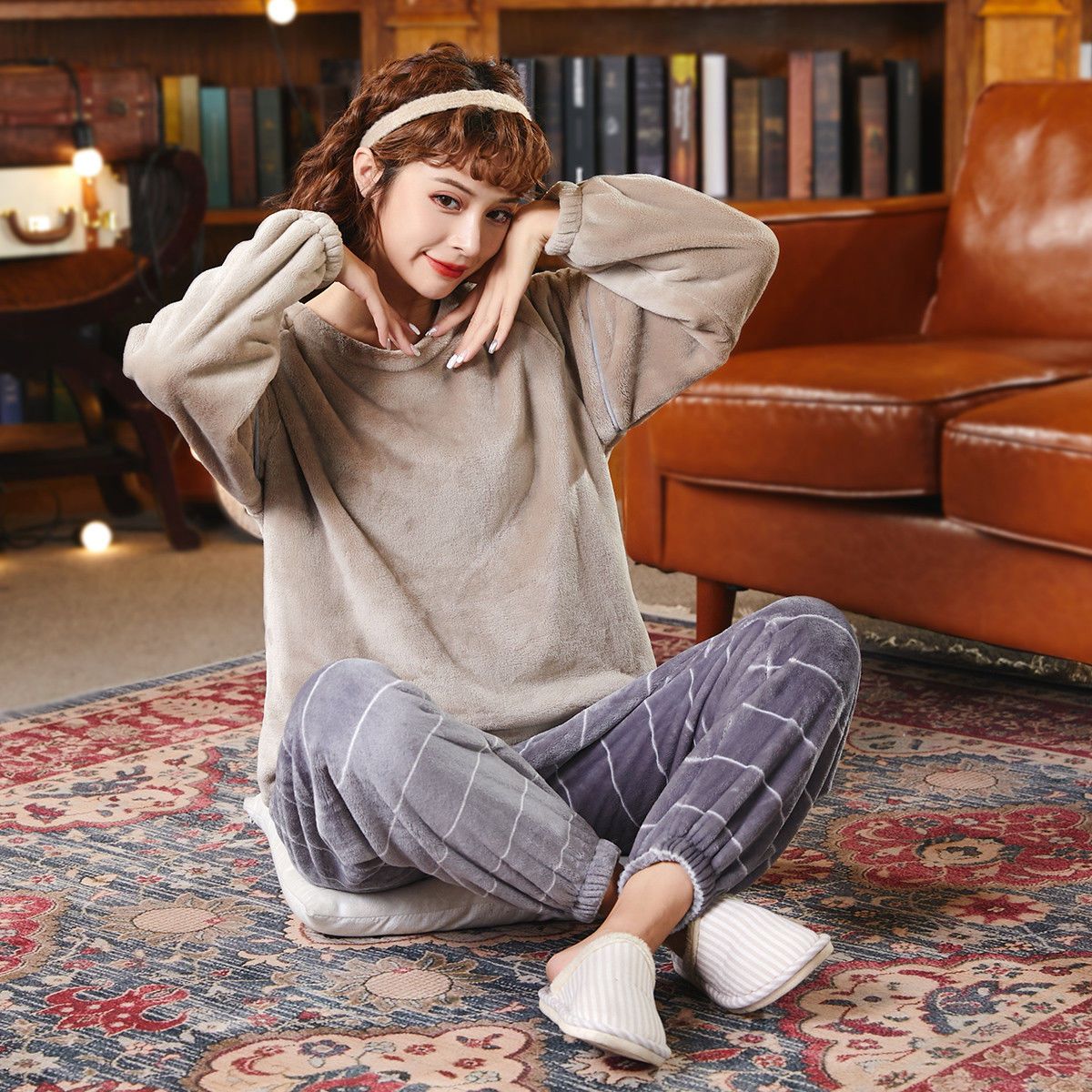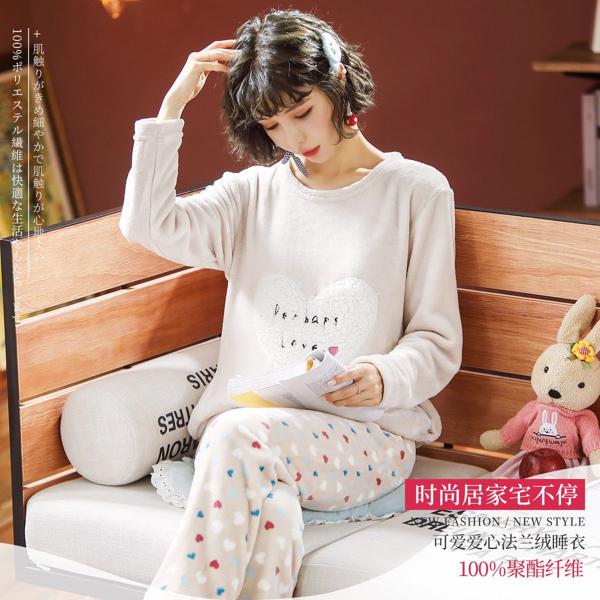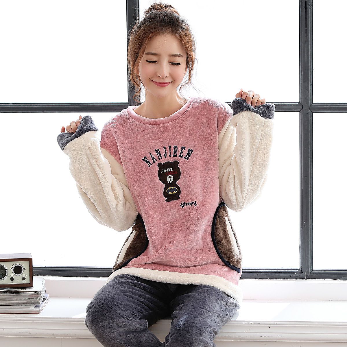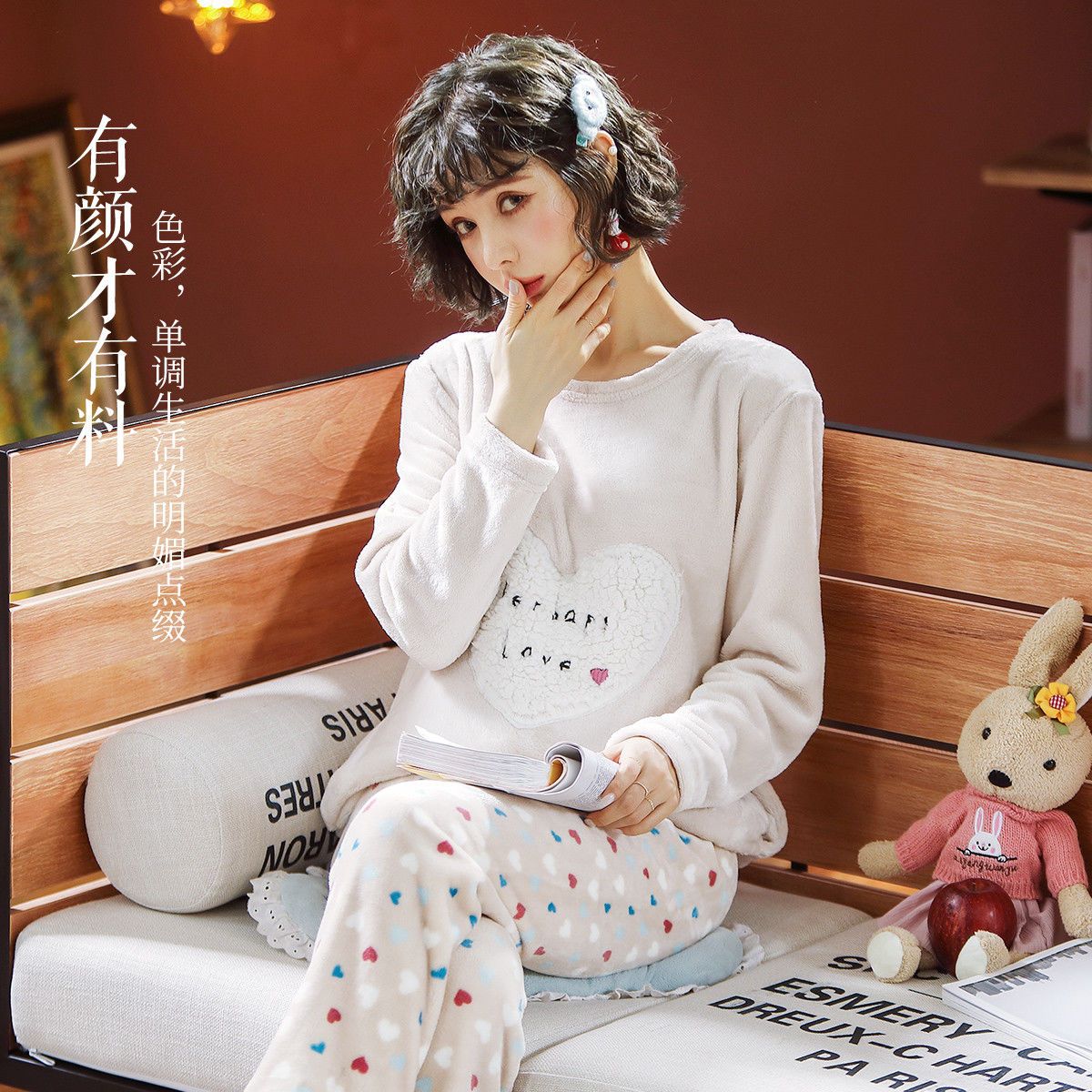 商品名称:帕兰朵女法兰绒加绒加厚秋冬长袖珊瑚绒睡衣甜美套头家居服两件套