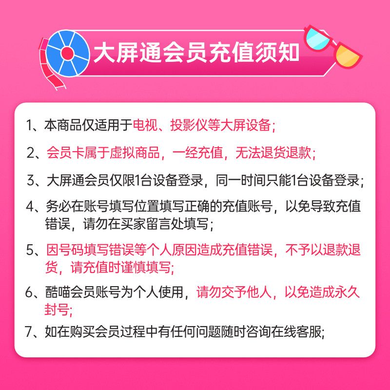 商品名称:优酷酷喵大屏通专享VIP会员年卡12个月直充秒充仅支持电视TV端